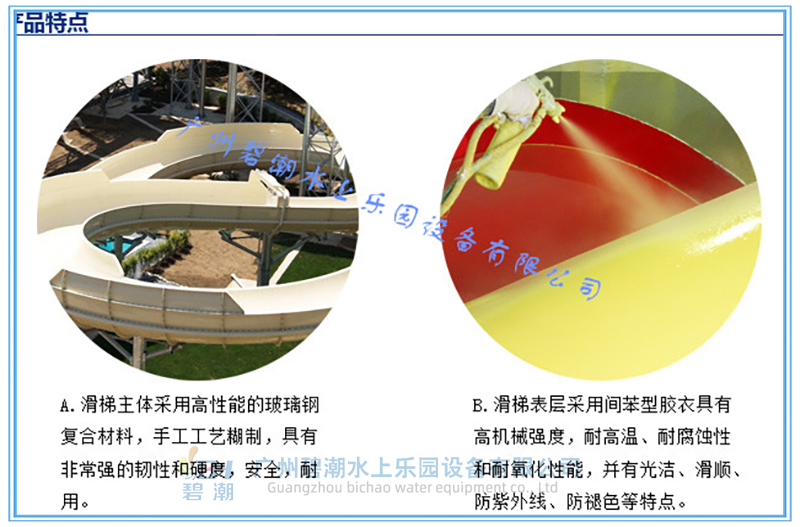B. 滑梯表層采用間苯型膠衣具有高機械強度,耐高溫、耐腐蝕性和耐氧化性能,并有光潔、滑順、防紫外線、防褪色等特點。